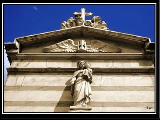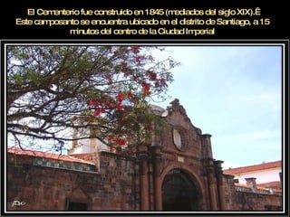 El Cementerio La Almudena en Cusco, Perú data de 1845 y se encuentra a 15 minutos del centro de la ciudad. Representa la cosmovisión andina a través de pinturas murales en la entrada que muestran tradiciones mestizas, fiestas patronales y el Día de los Muertos, así como danzas folclóricas de la región de Cusco. La iglesia del cementerio está dedicada a la Virgen de la Almudena, en honor al obispo devoto que donó su imagen y pidió ser enterrado allí.