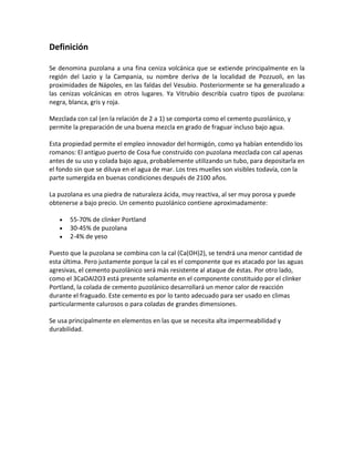 Este documento describe las propiedades y usos de la puzolana, una ceniza volcánica que cuando se mezcla con cal actúa como cemento. La puzolana mejora la resistencia del cemento a los sulfatos, cloruros y agua de mar. Los romanos usaron puzolana para construir el Panteón y otros edificios que aún se mantienen en pie después de siglos. La puzolana se usa hoy en día para mejorar la durabilidad del cemento y el hormigón.