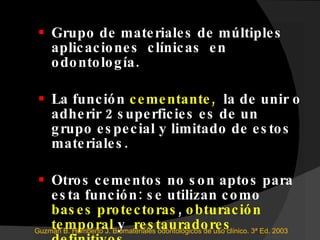 El documento describe diferentes tipos de cementos utilizados en odontología, incluyendo sus propiedades, composiciones y usos clínicos. Se dividen los cementos en nueve clases principales como cementos de óxido de zinc, fosfato de zinc, silicato, polímeros y policarboxilato de zinc. Cada clase tiene ventajas y usos específicos como obturación temporal, cementación permanente o materiales anticariogénicos.