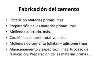 El documento describe los procesos de fabricación del cemento, sus propiedades y composición química. También explica los diferentes tipos de cementos especiales y los aditivos utilizados para modificar las propiedades del cemento, como aceleradores, retardadores, reductores de peso y aditivos para controlar la filtración.