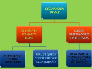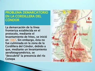 El documento habla sobre las disputas limítrofes entre Perú y Ecuador en el siglo XX, incluyendo incidentes en 1910 y 1922. También menciona que en 1981 Perú acusó falsamente a Ecuador de atacar una aeronave peruana en la frontera. Finalmente, detalla que en 1992 los presidentes de ambos países se reunieron en Quito para resolver las dificultades fronterizas.