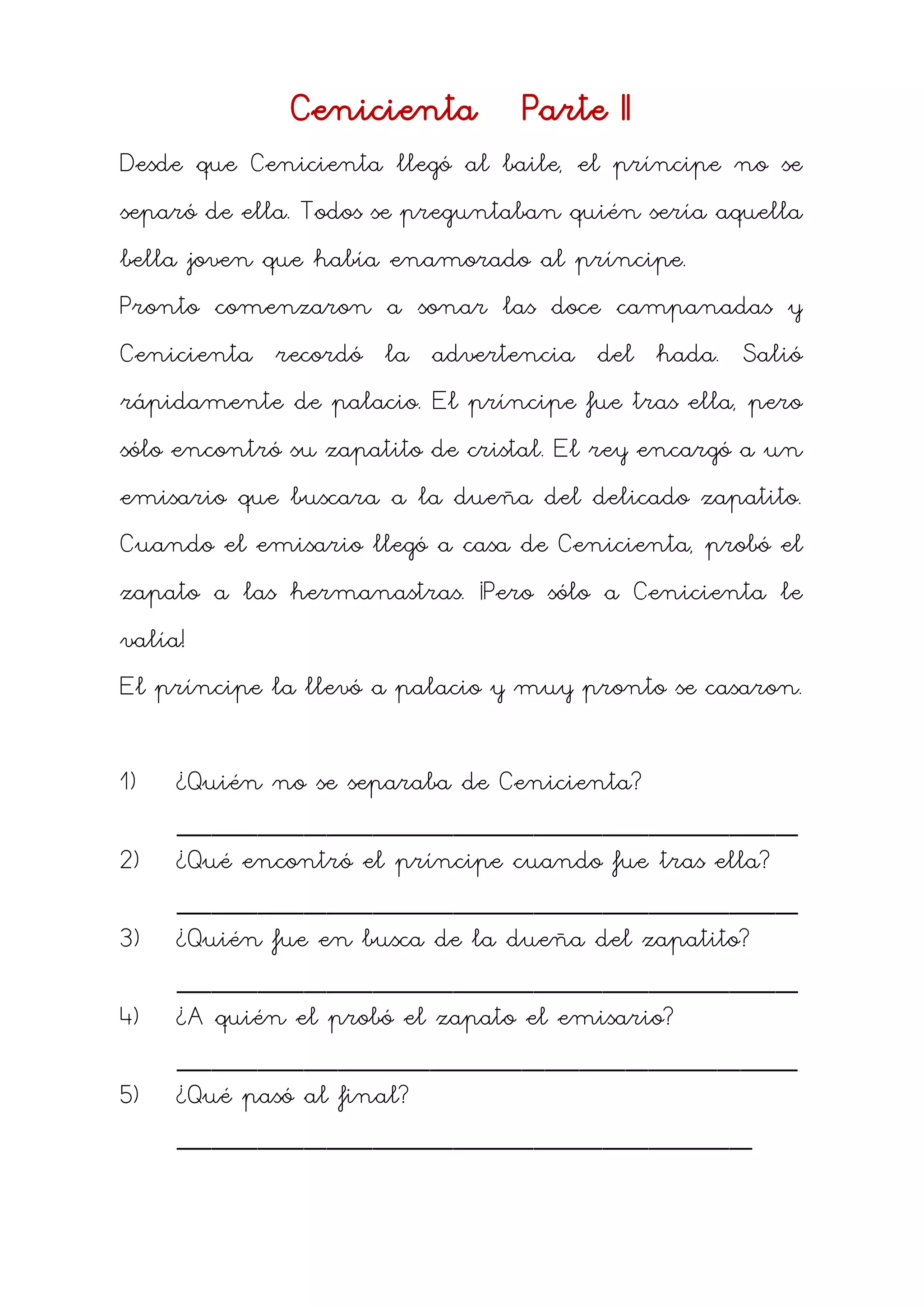El príncipe no se separó de Cenicienta en el baile. Cuando sonaron las doce campanadas, Cenicienta salió rápidamente del palacio dejando atrás su zapatito de cristal. El rey encargó a un emisario encontrar a la dueña del zapato, quien probó que sólo le quedaba a Cenicienta. Al final, el príncipe se casó con Cenicienta.