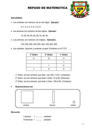Este documento presenta una revisión de conceptos matemáticos fundamentales como las centenas, decenas y unidades. Explica que 1 centena equivale a 10 decenas o 100 unidades, y proporciona ejercicios para practicar la descomposición y conversión de números entre sus diferentes órdenes de magnitud. También cubre temas como la lectura y escritura de números naturales, así como su descomposición en sumandos de unidades según su valor posicional.