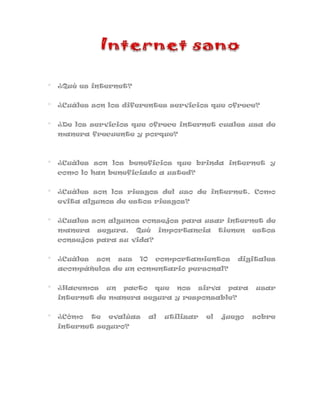 El documento proporciona información sobre el uso seguro y responsable de Internet. Ofrece consejos como no compartir información personal, no enviar fotos sin permiso, no responder mensajes agresivos, y establece un pacto para usar Internet de forma segura que incluye no dar información personal a desconocidos y reportar contenido que cause malestar. También describe servicios de Internet como páginas web, correo electrónico y redes sociales, y sus beneficios como encontrar recursos educativos, así como riesgos como información inadecuada e intimidación.