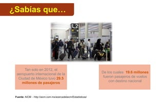 Este documento promueve la oportunidad de proyectar una marca en los techos de la Central de Abastos de la Ciudad de México para captar la atención de los casi 30 millones de pasajeros que viajan a través del aeropuerto cada año. Colocar la marca en un área de 300 hectáreas permitiría que sea visible desde el aire y exponga la marca a una audiencia amplia de visitantes y residentes de la ciudad de manera exclusiva. Se muestran imágenes ilustrativas de cómo podría verse la marca proyectada en los tech