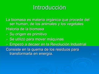 La biomasa se refiere a materia orgánica procedente de seres humanos, animales y plantas que puede quemarse para generar energía. Existen diferentes tipos de biomasa como la biomasa natural, los cultivos energéticos, los excedentes agrícolas y la biomasa residual. Una central eléctrica de biomasa quema estos residuos orgánicos para producir energía eléctrica de forma renovable y más limpia que los combustibles fósiles.