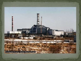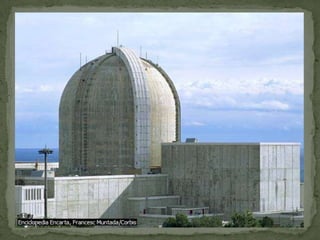El documento describe tres centrales nucleares: una en Japón que genera electricidad y reduce la dependencia del petróleo, una en España llamada Vandellòs II ubicada en Tarragona, y la de Chernóbil en Ucrania que sufrió el peor accidente nuclear en 1986 requiriendo un sarcófago para contener los desechos radiactivos. También define una central nuclear como una central térmica que usa material radiactivo en procesos de fisión para generar energía eléctrica.