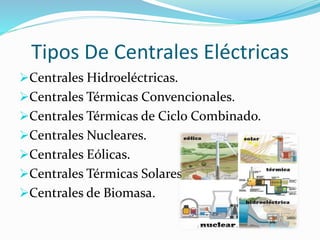 Este documento describe los diferentes tipos de centrales eléctricas, incluyendo centrales hidroeléctricas, térmicas convencionales, de ciclo combinado, nucleares, eólicas, solares y de biomasa. Para cada tipo, se proporcionan algunas de sus características principales, como el uso de la energía potencial del agua, combustibles fósiles o recursos renovables para generar electricidad.