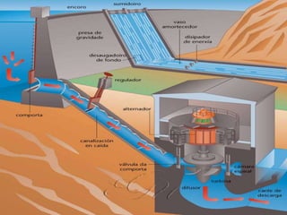 Este documento describe las centrales hidroeléctricas, incluyendo sus componentes principales como embalses, turbinas y generadores. Explica los diferentes tipos de centrales hidroeléctricas y cómo funcionan para convertir la energía hidráulica en energía eléctrica. También resume las ventajas como su bajo costo y no producir emisiones, e inconvenientes como tiempos de construcción largos y dependencia del clima. Finalmente, detalla los posibles impactos ambientales como la alteración del territorio y ciclos de vida de la fauna