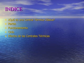 Una central térmica clásica consta de una caldera que quema carbón, combustible o gas para generar vapor de agua que mueve una turbina conectada a un generador eléctrico. El vapor se expande en la turbina para producir energía mecánica que se convierte en energía eléctrica. Las centrales térmicas producen lluvia ácida y contribuyen al efecto invernadero al emitir dióxido de carbono y otros gases. El efecto invernadero causa un aumento de la temperatura global y puede prov