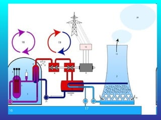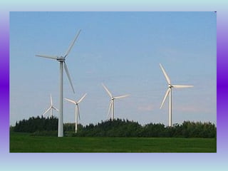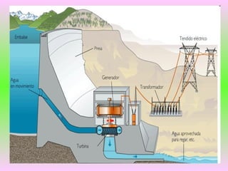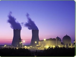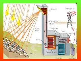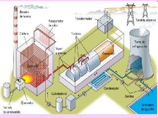 El documento describe los diferentes tipos de centrales eléctricas y cómo producen energía. Las centrales térmicas usan combustibles fósiles para generar vapor que hace girar las turbinas. Las centrales hidroeléctricas aprovechan la energía del agua y las nucleares usan el calor del uranio. También menciona centrales solares térmicas y eólicas que usan la luz solar y el viento respectivamente. Finalmente, enumera algunas centrales específicas en Teruel y Zaragoza.