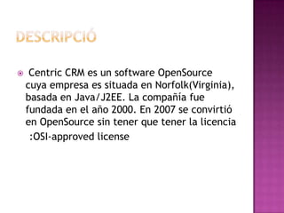 Centric CRM es un software de gestión de relaciones con clientes de código abierto basado en Java/J2EE desarrollado por una empresa ubicada en Norfolk, Virginia. Se convirtió en de código abierto en 2007 sin necesidad de licencia y su principal enfoque es satisfacer las necesidades de los clientes.