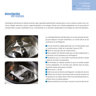 La centrífuga de cabezal oscilante es un equipo versátil y de gran capacidad, adecuado para diversas aplicaciones en medicina, biología y química, entre otros. Está controlada por un microprocesador y cuenta con múltiples adaptadores, una pantalla LCD y diversas funciones de seguridad. Su diseño robusto y estable asegura una durabilidad y un rendimiento óptimo en el laboratorio.