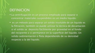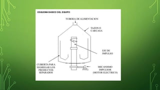 El documento describe los conceptos básicos de la centrifugación, incluyendo su definición, mecanismo de operación y factores que afectan la operación. También describe los diferentes tipos de equipos de centrifugación como las centrifugas tubulares, de cámara múltiple, de tazón y decantadoras, así como sus características y usos.
