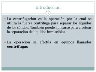 La centrifugación es una operación que utiliza la fuerza centrífuga para separar sólidos de líquidos o líquidos de líquidos. Existen tres tipos principales de centrífugas clasificadas por la fuerza centrífuga generada y su capacidad para manejar sólidos. Factores como la viscosidad, tamaño de partículas, velocidad y fuerza centrífuga afectan el rendimiento de la separación en centrífugas.