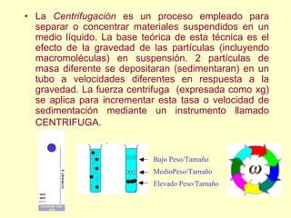 La centrifugación separa partículas en solución mediante sedimentación diferencial aplicando una fuerza centrífuga. Las partículas experimentan una fuerza dependiendo de la velocidad angular y el radio de rotación, lo que permite separarlas según su tamaño y densidad. Las centrifugas son utilizadas en laboratorios para separar diversos componentes biológicos como células, proteínas y ácidos nucleicos.