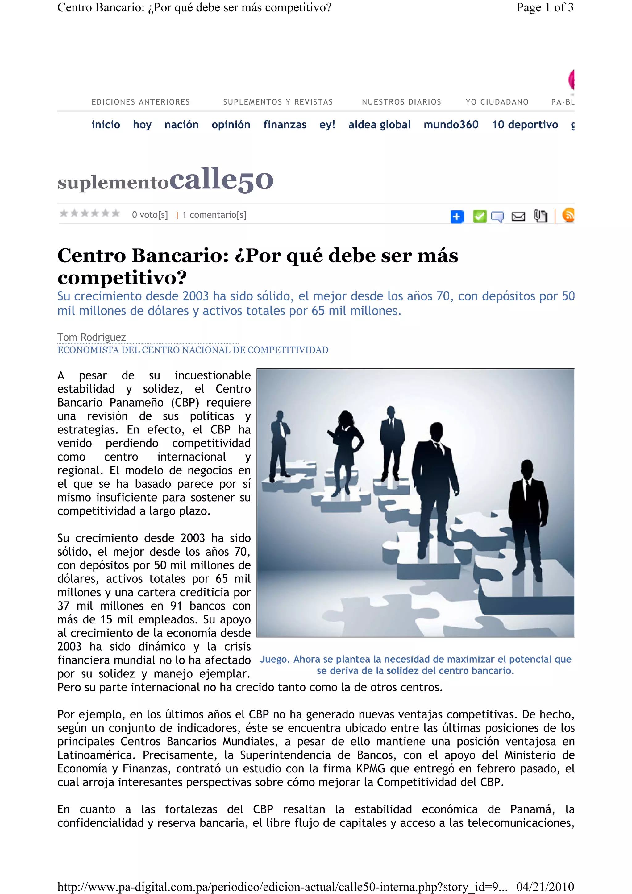 El documento analiza por qué el Centro Bancario de Panamá debe ser más competitivo. A pesar de su estabilidad, ha perdido competitividad como centro internacional y regional. Se identifican fortalezas como la estabilidad económica y debilidades como la percepción de paraíso fiscal. Un estudio propone atraer nuevos bancos, productos y clientes, y posicionar a Panamá como principal centro bancario de Latinoamérica mediante mejoras regulatorias, desarrollo de capital humano y tecnológico.