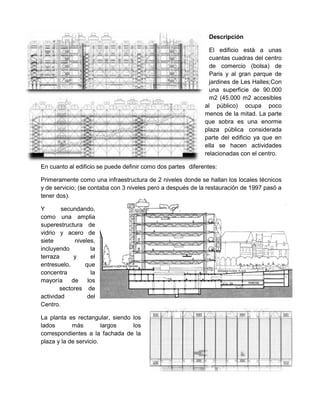 El Centro Cultural George Pompidou se construyó en París en la década de 1970 como parte de la renovación urbana del área de Les Halles. El presidente George Pompidou impulsó el proyecto para revitalizar económica, física y socialmente este sector de la ciudad. Los arquitectos Richard Rogers y Renzo Piano ganaron el concurso para diseñar el edificio. Su diseño innovador exhibe las tuberías y estructuras en el exterior, lo que causó controversia inicial pero ahora es reconocido como un hito de la arquitectura moderna