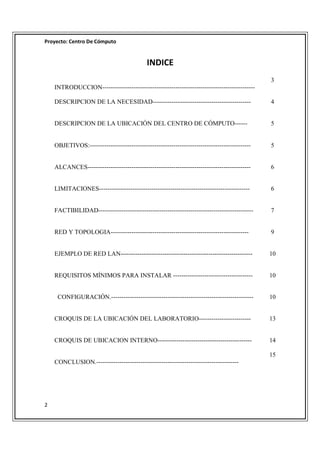 Este documento presenta un proyecto para crear un centro de cómputo en el CONALEP 262 en Ocosingo, Chiapas. El centro de cómputo permitirá a los estudiantes completar sus tareas y prácticas. Incluirá 15 computadoras, acceso a Internet, y herramientas para mantenimiento. El objetivo es mejorar los resultados académicos de los estudiantes y reducir la deserción escolar. El centro se ubicará en el salón 5102 y contará con personal capacitado para su operación y mantenimiento.
