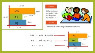 El documento describe los pasos para calcular el centro de gravedad de 3 áreas. Primero se nombran y miden las áreas A1, A2 y A3. Luego se calculan las áreas. Después, se hallan los centros de gravedad individuales de cada área y sus coordenadas x e y. Finalmente, se suman las coordenadas ponderadas por el área para obtener el centro de gravedad total en (29,7; 61,11).