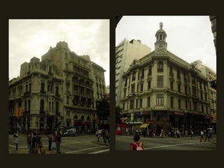 El documento describe un recorrido por el centro de Montevideo, Uruguay, mencionando lugares emblemáticos como la Avenida 18 de Julio, la Plaza Independencia con el monumento a Artigas, el Palacio Salvo y otros edificios históricos. También describe el Palacio Barolo en Buenos Aires, Argentina, el gemelo del Palacio Salvo, el cual fue diseñado por el mismo arquitecto Mario Palanti e inspirado en la Divina Comedia de Dante Alighieri.