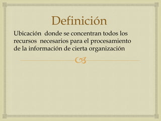 El centro de procesamiento de datos es donde se concentran los recursos necesarios para procesar la información de una organización. Realiza estudios, desarrollo de sistemas, capacitación, mantenimiento de sistemas y mejora de equipos de computo. Está compuesto de hardware como equipos y software con instrucciones, que deben funcionar juntos aunque son evaluados por separado. La organización opera el sistema central, mantiene copias de seguridad, registra fallas y mantiene los equipos siguiendo normas de seguridad.