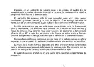 Malí es un país de África occidental con una superficie de 1,240,000 km2. El documento describe al pueblo Bo de Malí, que vive principalmente de la agricultura. También describe el Centro de Promoción de la Mujer en Touba, Malí, el cual ofrece formación en costura, bordados y alfabetización a niñas y mujeres para ayudarlas a salir de la pobreza. El centro necesita nuevos equipos de costura, mobiliario y máquinas de coser para ampliar sus operaciones.