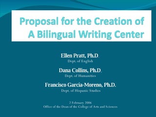 El documento propone la creación de un Centro de Redacción Bilingüe en la Universidad de Puerto Rico en Mayagüez para desarrollar las habilidades de escritura y comunicación de los estudiantes en español e inglés. El centro ofrecería tutorías individuales y grupales para estudiantes de pregrado y posgrado de todos los departamentos. Se implementaría en fases, comenzando con el Departamento de Estudios Hispánicos y expandiéndose a toda la universidad. Los objetivos incluyen mejorar las habilidades de es