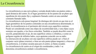Este documento describe la circunferencia y sus elementos. La circunferencia es una curva cerrada donde todos los puntos están a la misma distancia del centro. Tiene solo longitud. Sus elementos incluyen el centro, radio, diámetro, cuerda, arco y semicircunferencia. El documento también explica cómo encontrar el centro de una circunferencia trazando líneas perpendiculares entre los puntos medios de dos cuerdas.