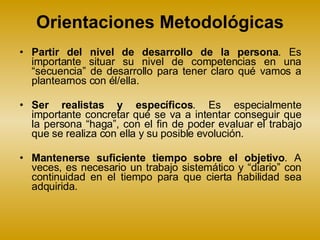 Este documento proporciona orientaciones metodológicas para trabajar con personas. Recomienda partir del nivel de desarrollo de cada persona, establecer objetivos específicos y realistas, y mantener un trabajo sistemático y continuado en el tiempo para lograr las habilidades. También sugiere utilizar refuerzos, evitar errores, descomponer objetivos en pasos pequeños, ser directivos y consistentes, y enfocarse en aprendizajes significativos y funcionales.