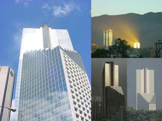El documento describe una obra inconclusa llamada Centro Financiero Confinanzas ubicada en Caracas. Mide aproximadamente 121,741 metros cuadrados y está delimitada por las avenidas Prolongación El Lago, Andrés Bello y la Calle Real de Sarría. Se destaca que sería el octavo edificio más alto de Latinoamérica y el segundo más alto de Venezuela.