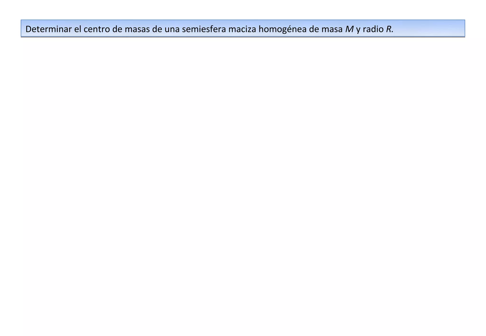 El documento describe cómo calcular el centro de masas de una semiesfera maciza homogénea. Explica que se usa la fórmula del centro de masas para sistemas continuos y que, debido a la simetría de la semiesfera, el centro de masas solo tendrá coordenada en el eje z. Luego, realiza los cálculos del numerador y denominador de la expresión para zcm, obteniendo que la coordenada z del centro de masas es 8R/3.
