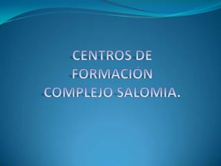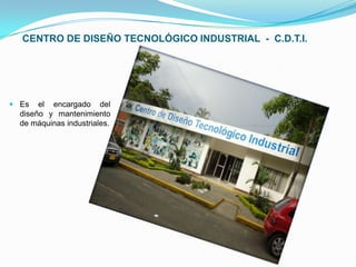 Este documento describe 4 centros de formación técnica y tecnológica que ofrecen una variedad de programas. El Centro de Diseño Tecnológico Industrial se enfoca en diseño y mantenimiento industrial. El Centro de Asistencia Técnica a la Industria se especializa en diseño de materiales y procesos de transformación. El Centro de Gestión Tecnológica de Servicios cubre comercio y servicios. Finalmente, el Centro de Electricidad y Automatización Industrial incluye automatización, electrónica e informática