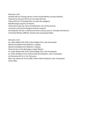 El documento lista los centros de acopio permanentes y temporales para la recolección de donaciones en León, Guanajuato. Incluye 9 centros de acopio permanentes con su ubicación, horarios y responsable de cada uno. También enumera 9 centros de acopio temporales con su ubicación, fecha y horario de recolección, y responsable organizador de cada evento.