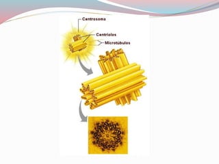 El centrosoma es un orgánulo celular presente en células animales que organiza los microtúbulos y participa en el crecimiento de cilios, la distribución de cromosomas durante la mitosis, y el mantenimiento de la estructura celular. Está formado por dos centriolos cilíndricos dispuestos perpendicularmente que organizan los microtúbulos y determinan dónde sucederá la división celular.