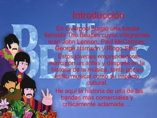 La banda The Beatles se formó en Liverpool en 1957 y estuvo integrada por John Lennon, Paul McCartney, George Harrison y Ringo Starr. Entre 1963 y 1970 sacaron 13 discos en sólo 7 años que marcaron un antes y un después en la historia de la música popular. A pesar de su éxito, tensiones internas llevaron a la separación de la banda en 1970.