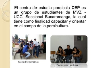 El Centro de Estudio Porcícola (CEP) es un grupo de estudiantes de la Universidad Cooperativa de Colombia en Bucaramanga cuya misión es promover el desarrollo del sector porcícola a través de la formación, educación y capacitación. El CEP organiza seminarios sobre reproducción, manejo y sanidad porcina con el apoyo de expertos. Su visión es posicionarse como un centro líder en la región a través de contribuciones continuas al crecimiento de la industria porcícola.