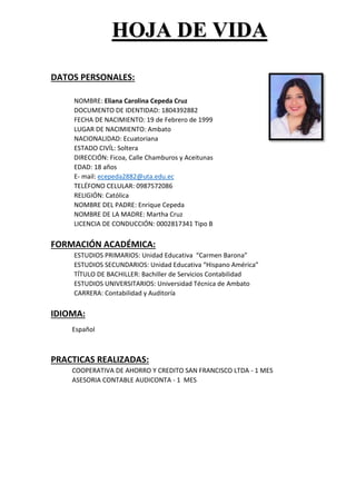 La hoja de vida presenta los datos personales de Eliana Carolina Cepeda Cruz, una mujer ecuatoriana de 18 años nacida en Ambato. Incluye su nombre, documento de identidad, fecha y lugar de nacimiento, estado civil, dirección, edad, correo electrónico, teléfono y religión. Además, detalla su formación académica primaria y secundaria, su título de bachiller en contabilidad y sus estudios universitarios actuales en contabilidad y auditoría en la Universidad Técnica de Ambato. Finalmente, resume brevemente