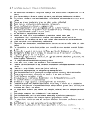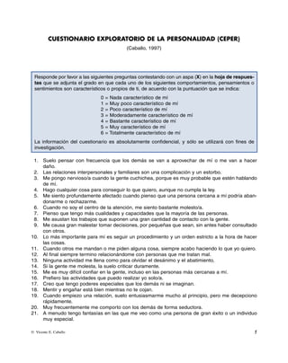 Este documento presenta el Cuestionario Exploratorio de la Personalidad (CEPER), un instrumento de evaluación psicológica desarrollado por Caballo en 1997. El cuestionario consta de 132 preguntas sobre pensamientos, sentimientos y comportamientos que los participantes deben responder indicando en qué medida son característicos de ellos mismos usando una escala de 0 a 6. El cuestionario busca recopilar información de manera confidencial con fines de investigación.