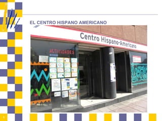 El documento describe las actividades y servicios del Centro Hispanoamericano de San Sebastián de los Reyes, cuyo objetivo es ser un referente cultural y fomentar la participación social intercultural. A fecha de noviembre de 2011, cuenta con 1516 usuarios, con un enfoque en asesoría jurídica, formación y empleabilidad, así como en ofrecer un espacio para la integración y el desarrollo cultural. El centro también organiza actividades recreativas y talleres para diversas edades y grupos sociales.
