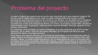La salud e higiene bucal es crucial y el cepillo dental es esencial para prevenir acumulación de gérmenes y enfermedades. Un 57% de las personas en entornos laborales y universitarios tienen dificultades para mantener su higiene oral, lo que motiva el diseño de un cepillo dental ergonómico con dispensador de crema integrado, fácil de transportar y usar. Este producto se fabricará mediante impresión 3D con material ABS, y se considera económicamente viable.