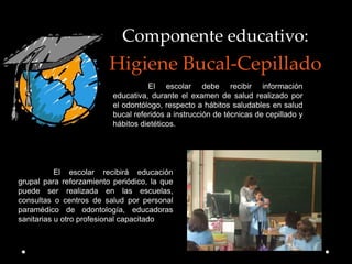 Este documento proporciona información sobre la técnica de cepillado dental y la importancia de la educación en hábitos de higiene bucal. Explica que los odontólogos deben educar a los escolares sobre técnicas de cepillado y dieta durante los exámenes de salud bucal. También señala que los escolares deben recibir educación periódica en grupos sobre hábitos de higiene bucal por parte de personal capacitado. Finalmente, describe las técnicas de cepillado recomendadas para niños y la