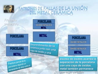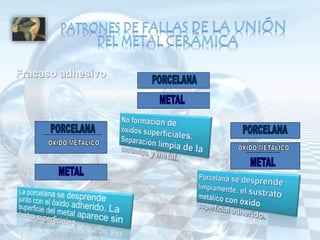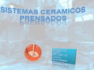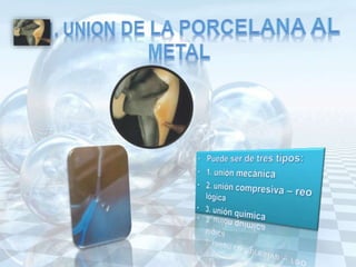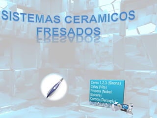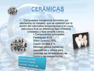El documento detalla la composición, propiedades y aplicaciones de diversas cerámicas dentales, incluyendo porcelanas feldespáticas y circoniosas, así como su proceso de fabricación. Se enfatizan las características mecánicas, estéticas y la unión con estructuras metálicas, además de discutir las técnicas de procesamiento como sinterización y fresado. También se abordan las ventajas y desventajas de cada tipo de cerámica en función de su rendimiento clínico.