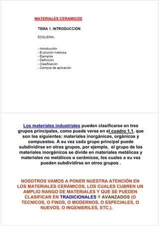 Este documento trata sobre los materiales cerámicos. Explica que los materiales cerámicos cubren un amplio rango de materiales que pueden clasificarse en tradicionales y avanzados. Luego describe las principales características de los materiales cerámicos avanzados, incluyendo el uso de materias primas de alta pureza, un procesamiento sujeto a un control preciso, y una microestructura bien controlada. Finalmente, explica algunas aplicaciones importantes de los materiales cerámicos avanzados clasificadas por su función.