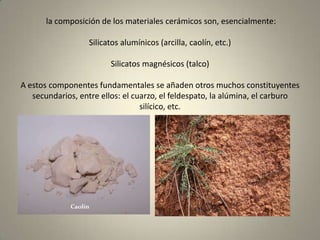 Este documento describe los materiales cerámicos, que se obtienen al cocer mezclas de arcilla u otros materiales naturales con aditivos. Los cerámicos se clasifican en porosos, semi compactos o compactos dependiendo de su estructura y permeabilidad. Sus principales características son la resistencia al calor y la corrosión, y su capacidad de aislamiento térmico y eléctrico.