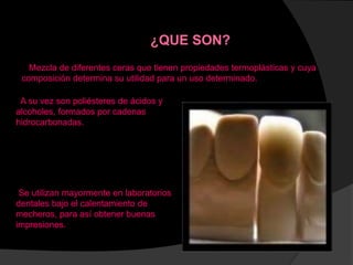 Las ceras dentales son mezclas de diferentes ceras que se utilizan principalmente en laboratorios dentales. Están compuestas por grasas, resinas, aceites y pigmentos. Se clasifican en ceras para patrones, de procesado e impresión. Algunos tipos comunes incluyen parafina, microcristalinas y ceresina. Tienen propiedades como intervalo de fusión y pueden ser maleables o ductiles.
