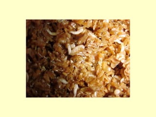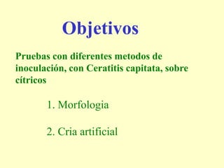 Este documento describe los métodos para criar artificialmente la mosca de la fruta Ceratitis capitata, incluyendo la recolección de huevos, la dieta larvaria, la recogida de pupas y el mantenimiento de adultos. Se proporcionan detalles sobre la morfología de las larvas y el proceso de crianza, como la siembra de larvas en bandejas con agua y alimento y la recogida posterior de pupas para su traslado a jaulas de adultos.