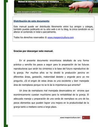 Este documento proporciona información sobre el manejo adecuado de las cerdas de reemplazo para prepararlas como futuras reproductoras. Explica que las cerdas deben ser seleccionadas a las 30 semanas con un peso mínimo de 300 libras y alojadas en cuarentena por 30-40 días, donde reciben vacunaciones, tratamientos y se aclimatan a la granja. También cubre detalles sobre nutrición, alojamiento y otros requisitos para lograr cerdas primerizas saludables y productivas.