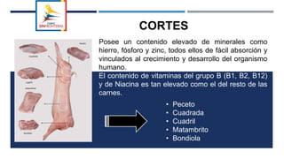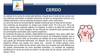 La carne de cerdo tiene un alto valor nutricional, con proteínas de alto valor biológico y una composición de grasa saludable. La calidad sensorial de la carne de cerdo incluye un color rosa pálido cuando cruda y gris claro cuando cocinada, así como una textura suave. Existen diferentes cortes de carne de cerdo como el lomo, la nalga, el asado y la bondiola.