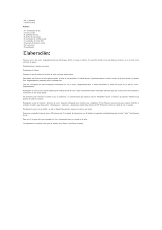Este documento proporciona una receta para cerdo relleno. Incluye instrucciones para preparar el relleno con pan, huevo cocido, salchichas, ajo, cebolla y pimiento. Luego explica cómo rellenar y cocinar el lomo de cerdo en una cazuela con aceite, cebolla, zanahorias y otros ingredientes. Finalmente, se recomienda servir el cerdo relleno con patatas fritas u otros acompañamientos.